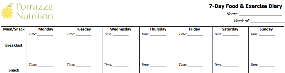 Blank 7 day food and exercise diary to track. Includes space to track 3 meals, 3 snacks, time, and daily exercise.
